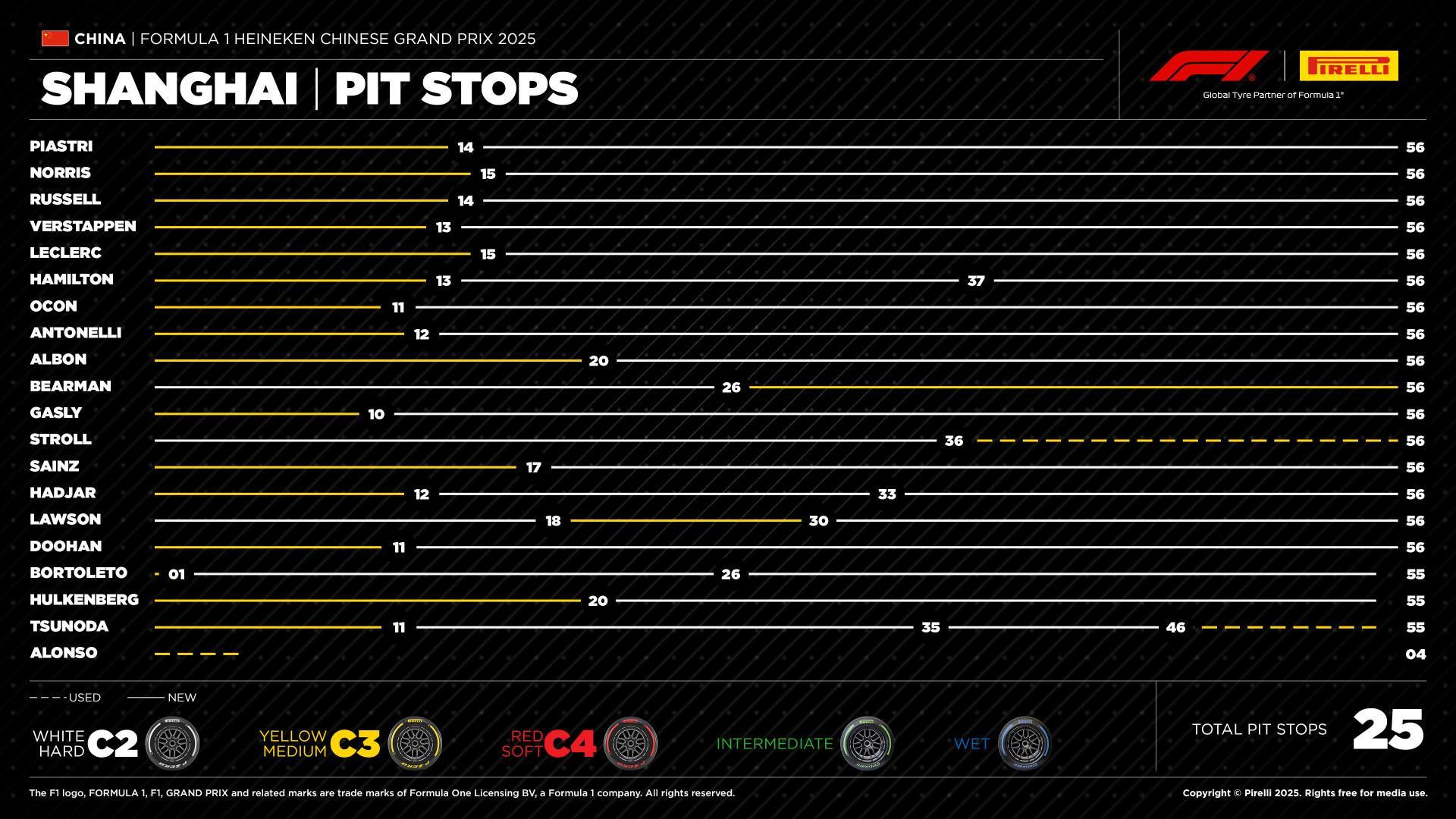 2025赛季,只有三位车手使用硬胎起跑,其余车手都选择了中性胎。全程无人使用软胎。最常见的策略是一停,即在最后阶段使用最硬的轮胎跑很久。赛道数据显示,硬胎的颗粒化程度较低,即使在长距离也能保持稳定的性能。登上领奖台的车手都在第14圈到第15圈之间进站。迈凯伦最终包揽一二,皮亚斯特里最终夺冠,队友诺里斯获得亚军,拉塞尔获得季军。